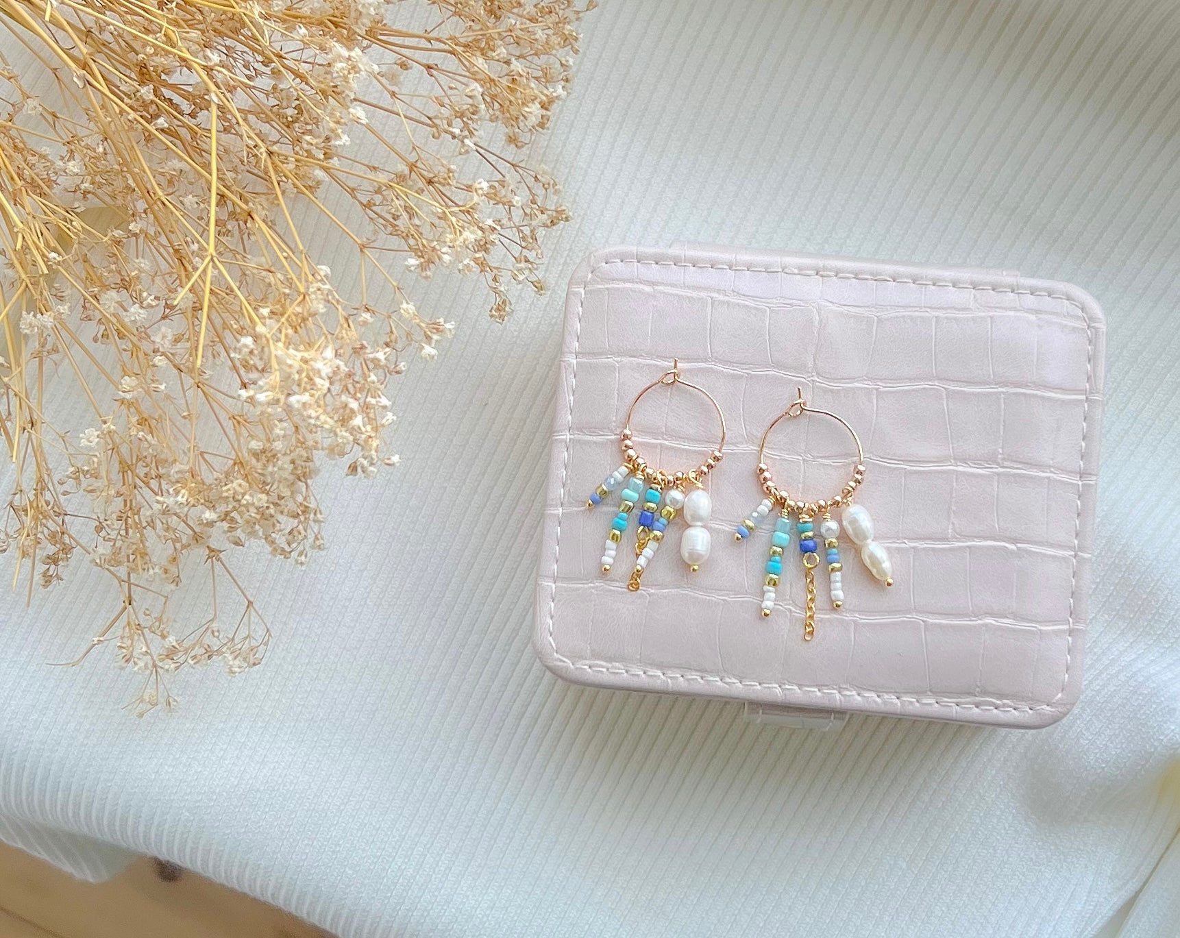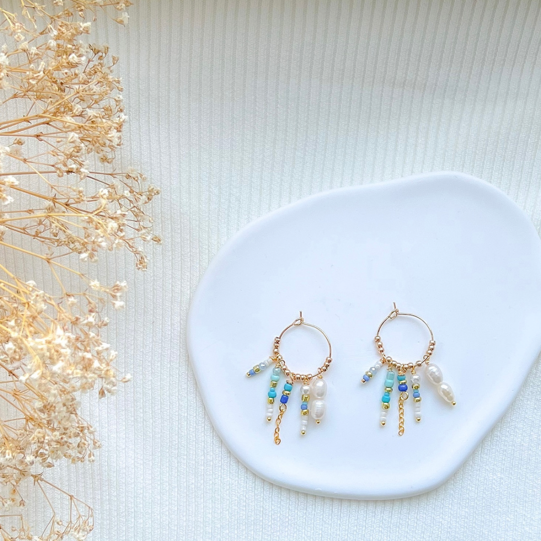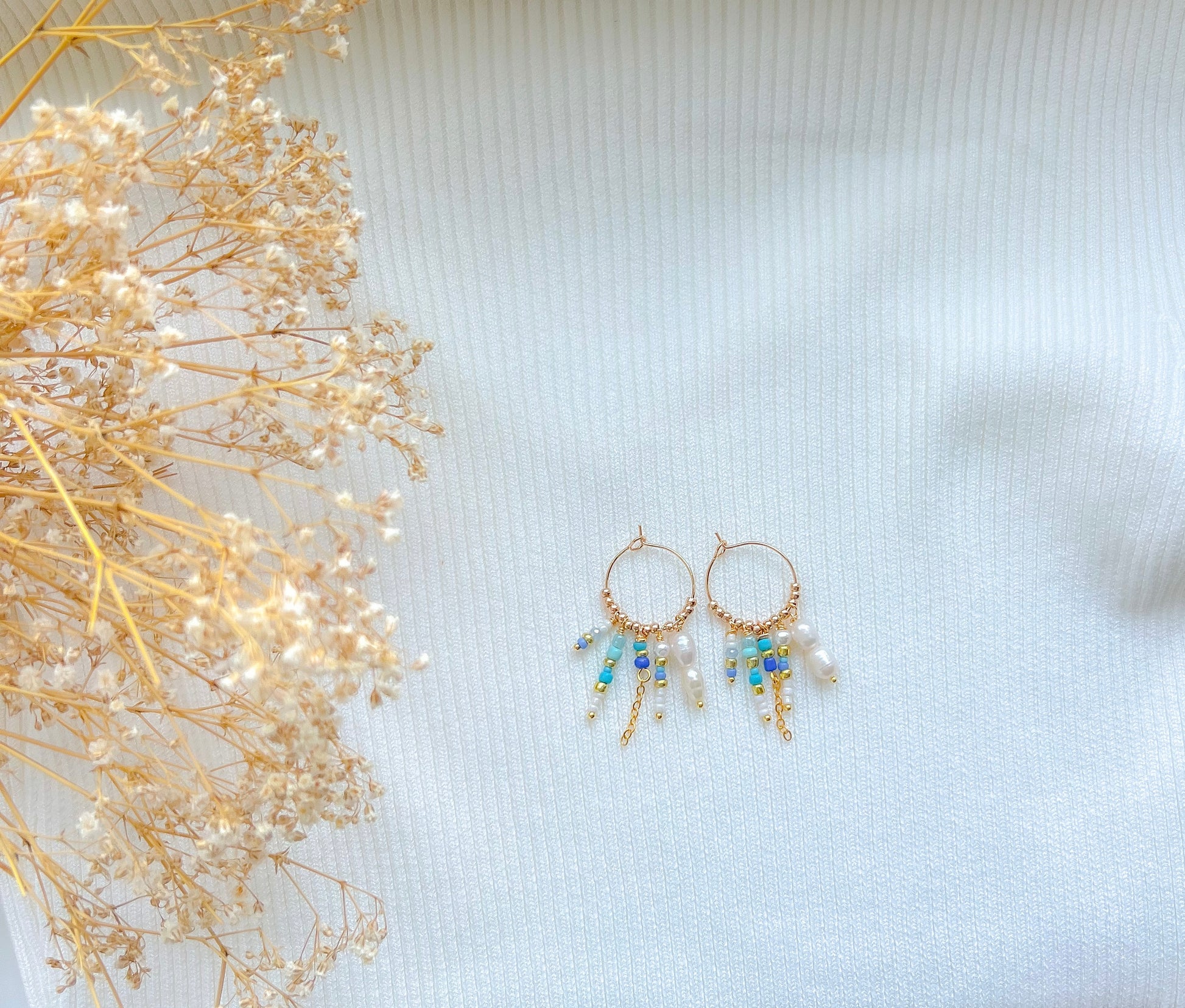 Super smukke øreringe med de flotteste blå farver og ferskvandsperler.