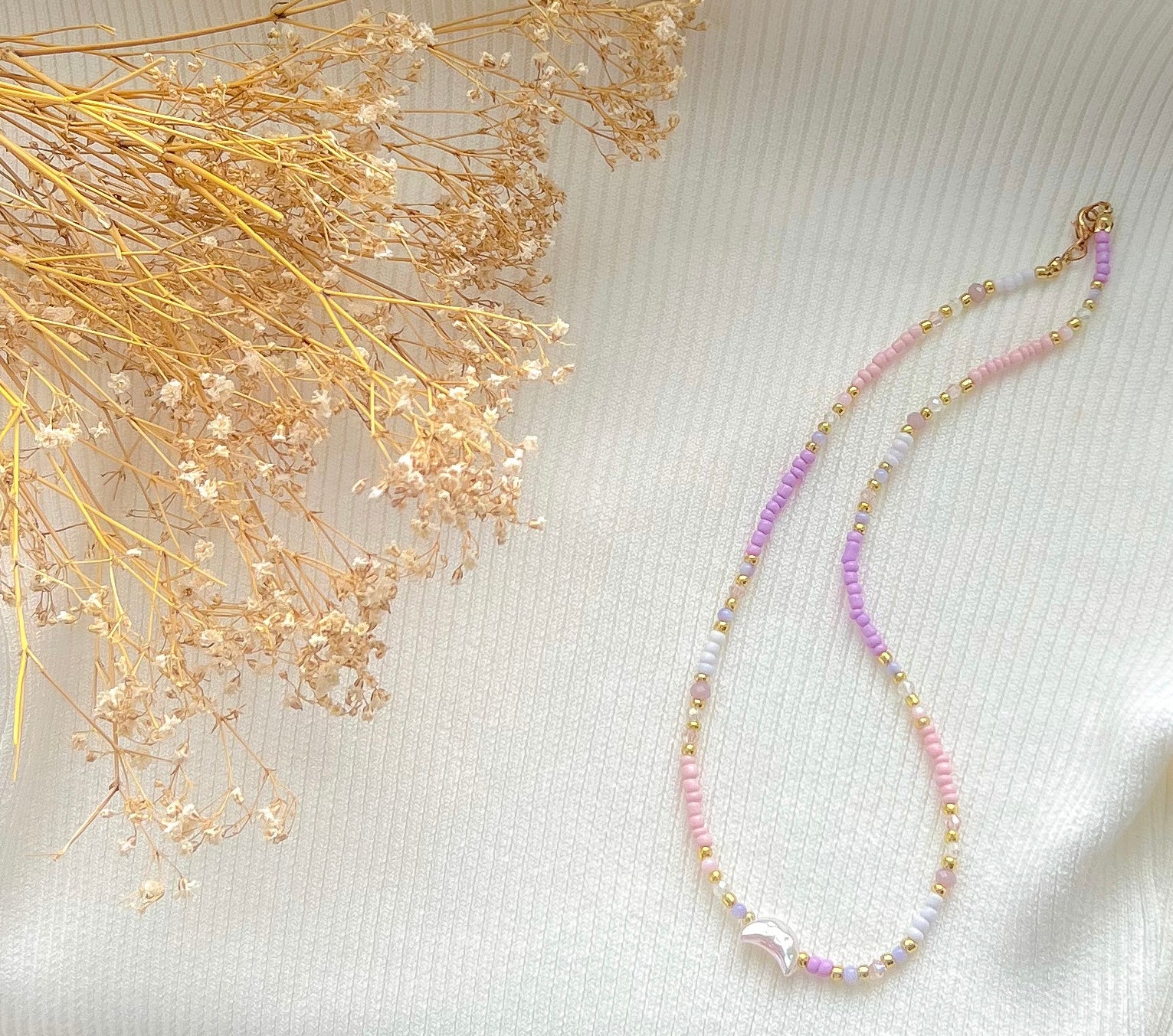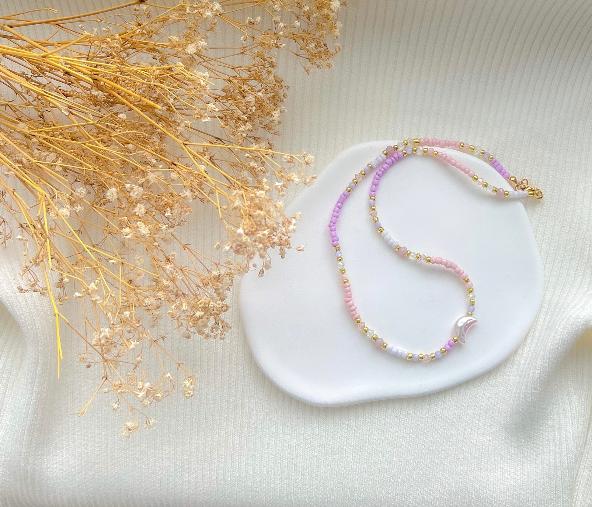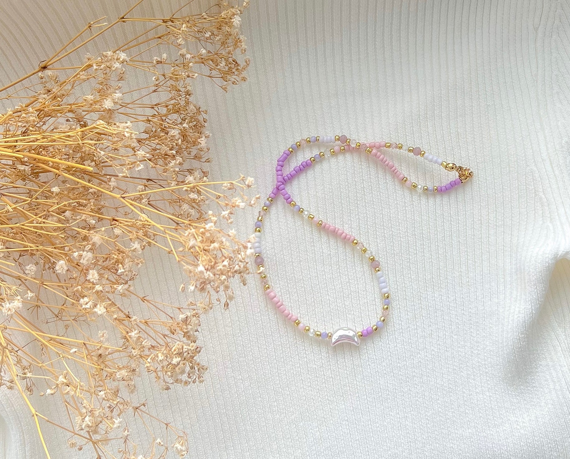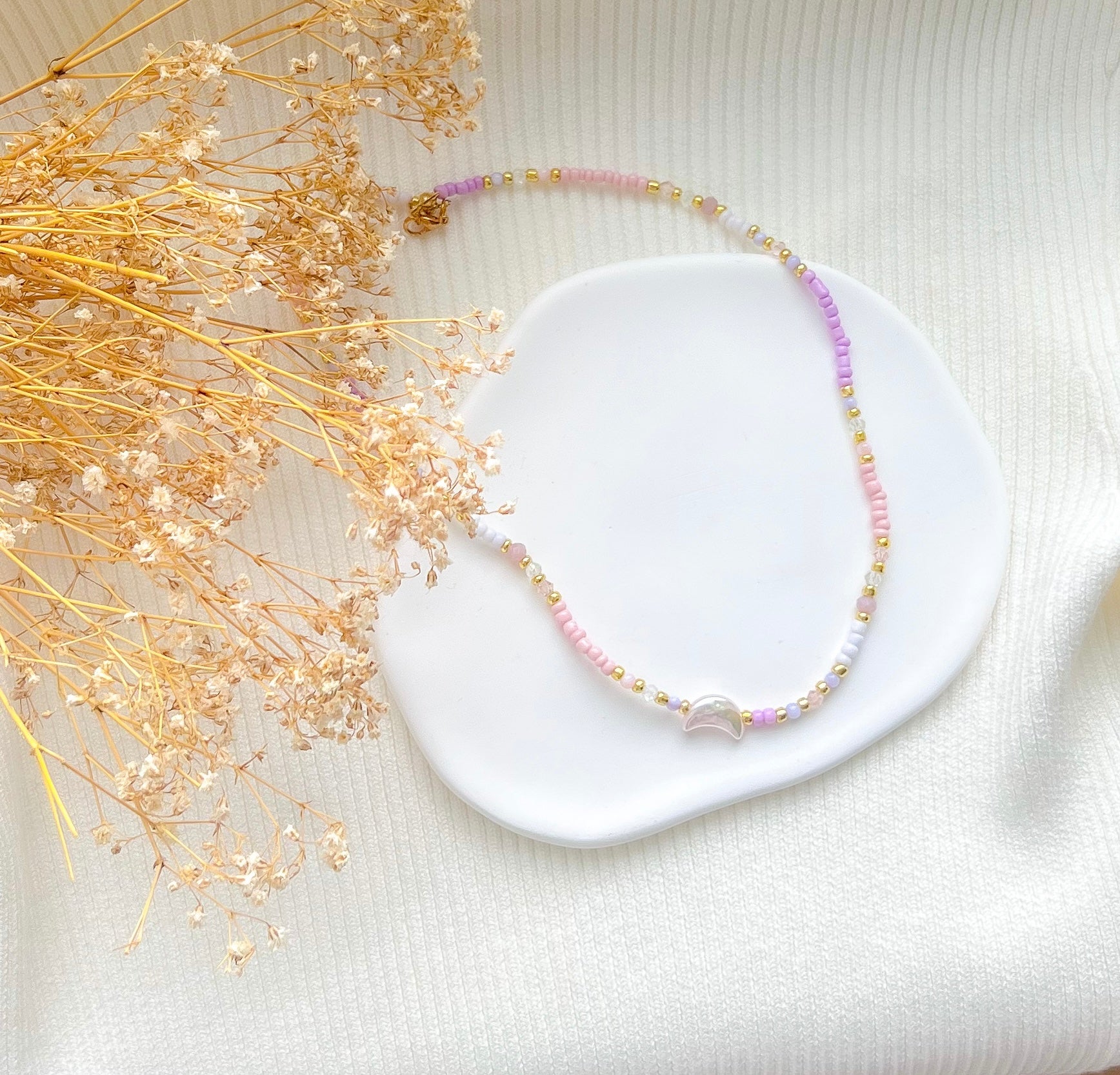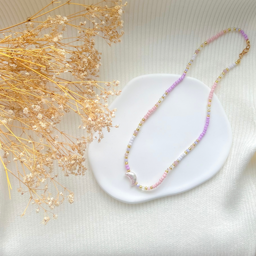 Den smukkeste halskæde med de flotteste farvede perler og et super smukt måne vedhæng.
