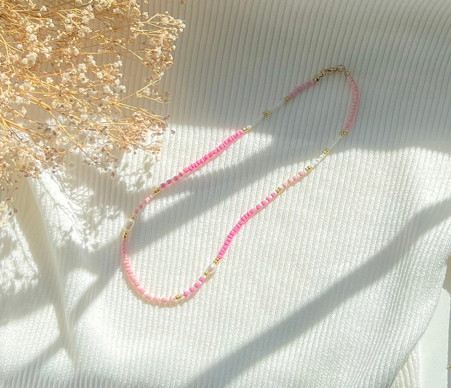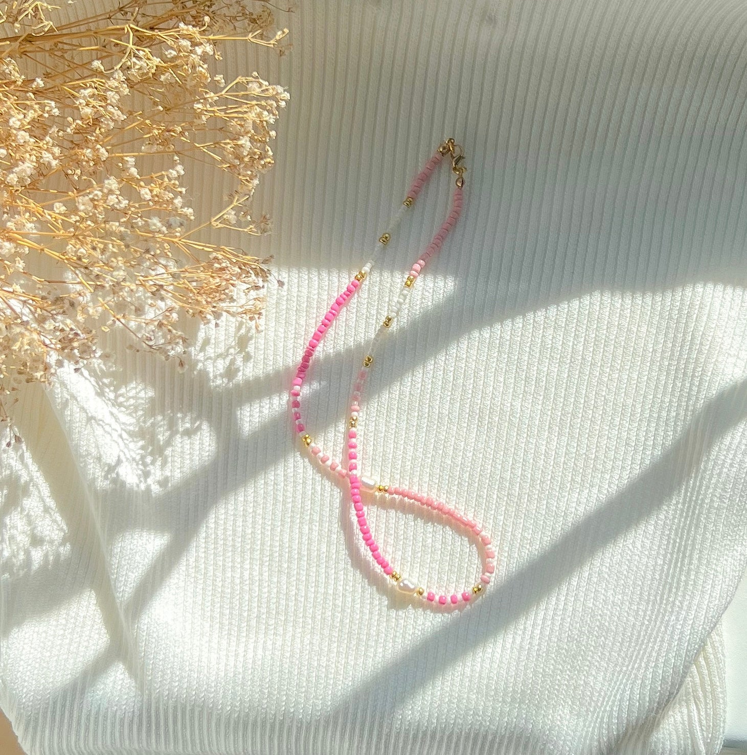 Den smukkeste halskæde med de flotteste lyserøde farver og ferskvandsperler.